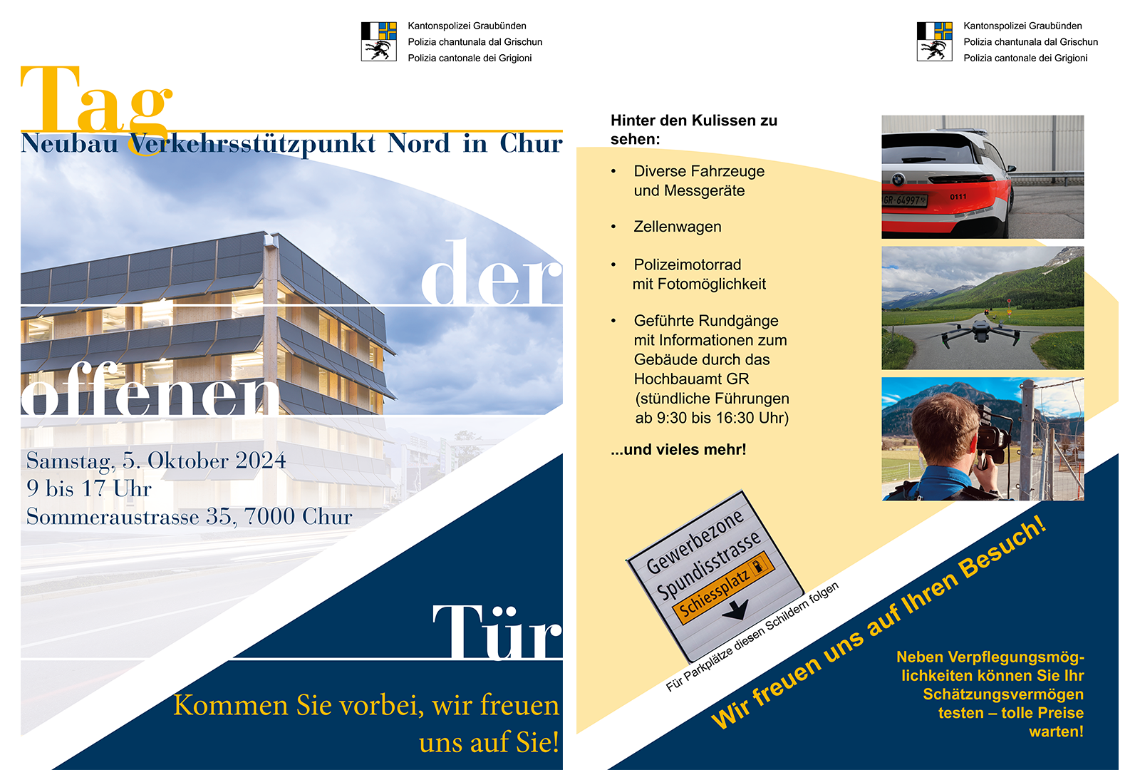 Der Verkehrsstützpunkt Nord konnte im August 2024 in Betrieb genommen werden. Die Kantonspolizei Graubünden lädt zum Tag der offenen Tür am Samstag, 5. Oktober 2024 ein.