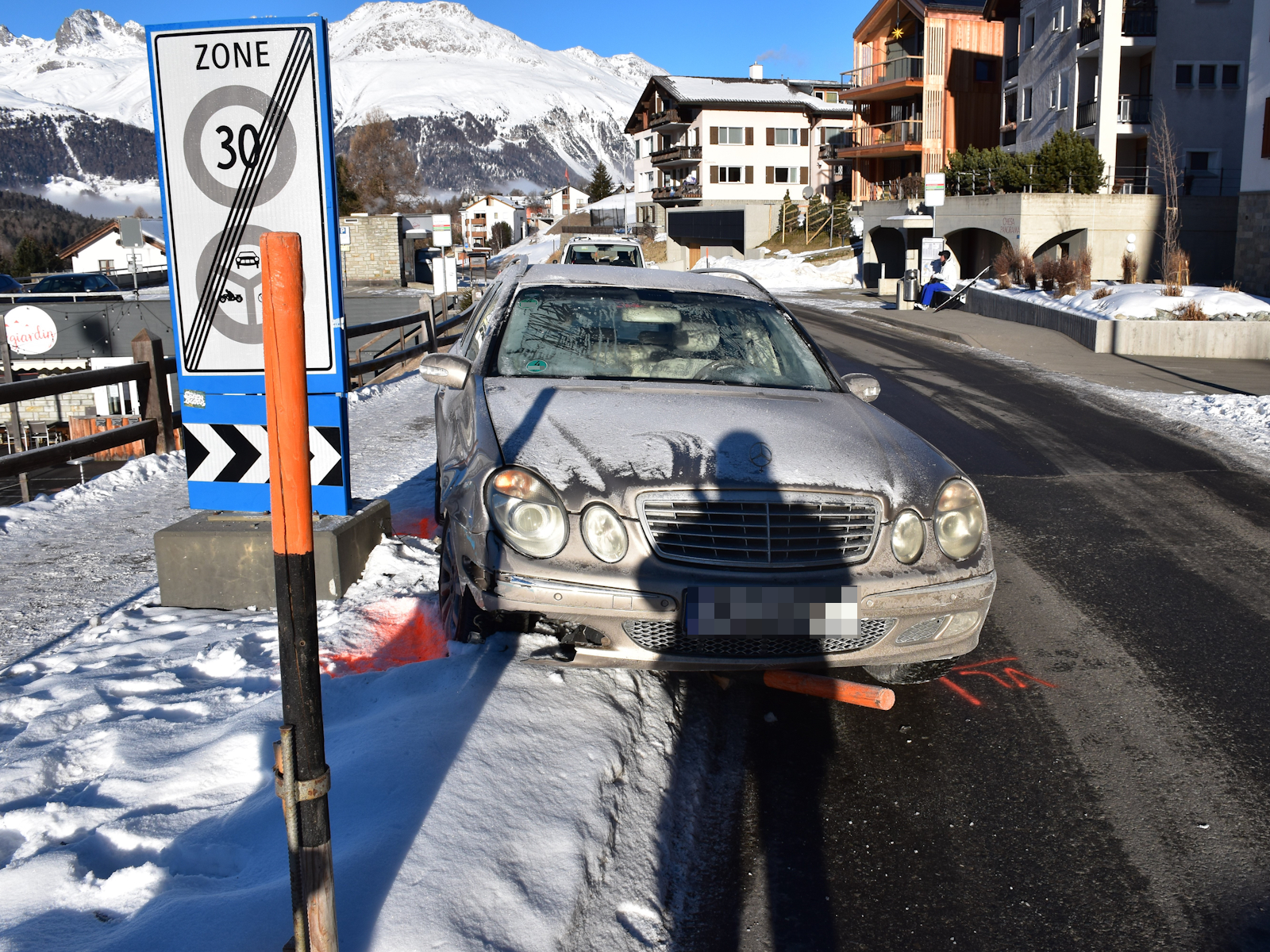 Die 19-Jährige fuhr gegen 09.30 Uhr von Muragls kommend über die Via Maistra dorfeinwärts in Richtung Pontresina. Während dieser Fahrt wurde die Sicht aufgrund von Eisresten auf der Frontscheibe, diese wurde nicht vollständig vom Eis befreit, sowie der Sonneneinstrahlung eingeschränkt. Dabei übersah die Frau die Fahrbahnverengung sowie das Zonensignal und kollidierte mit diesem. Die Kantonspolizei Graubünden veranlasste die Reparatur des Signals sowie den Transport des beschädigten Autos.