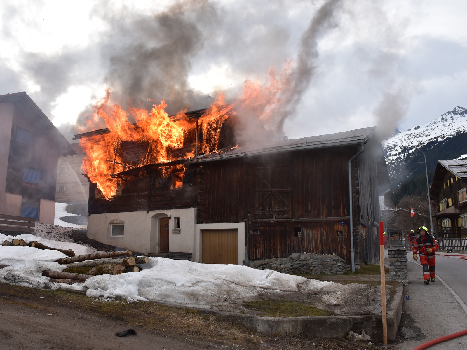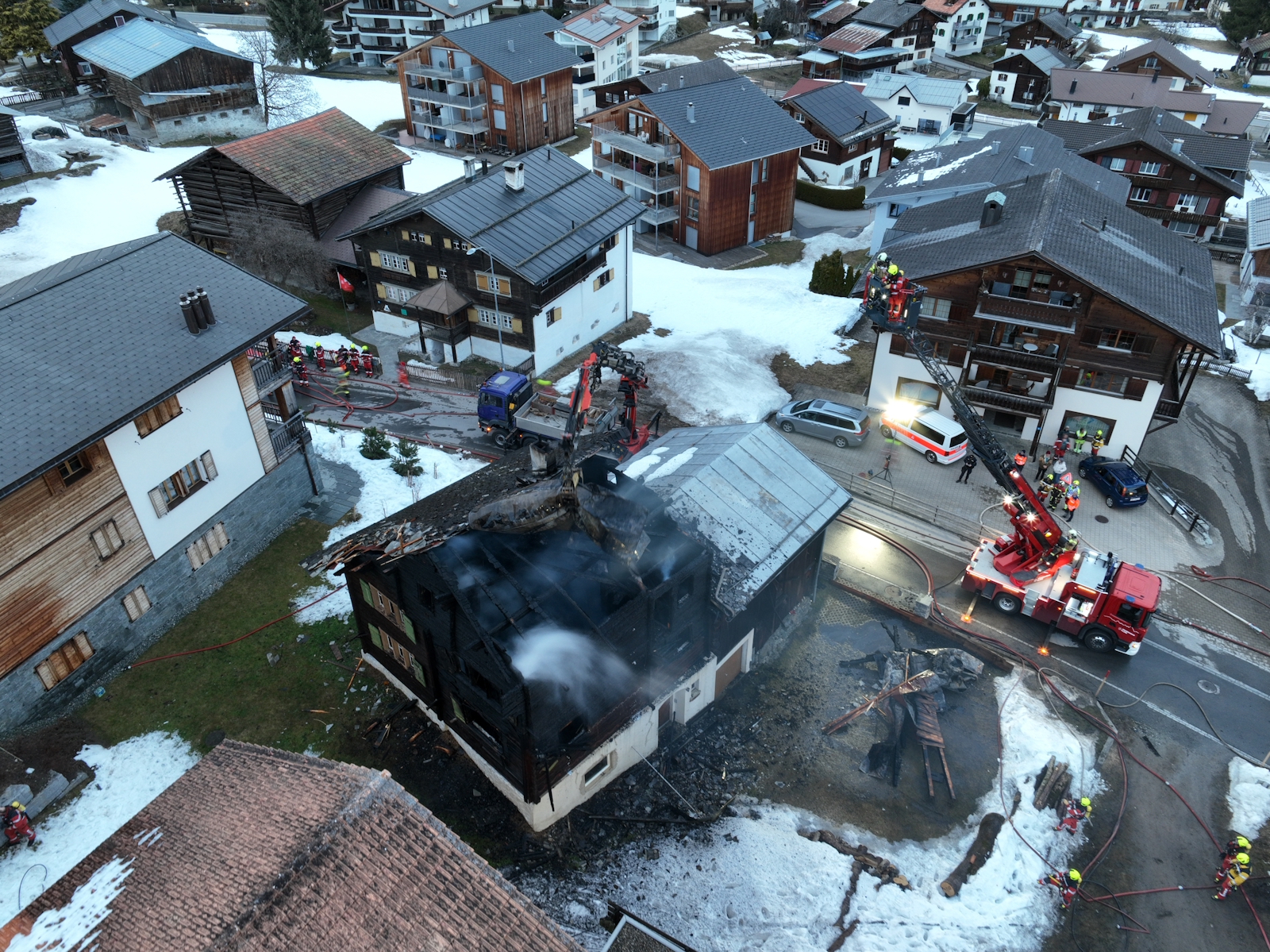 Die Meldung über den Brand ging kurz nach 16 Uhr bei der Einsatzleitzentrale der Kantonspolizei Graubünden ein. Die ausgerückte Gesamtfeuerwehr Breil/Brigels wurde durch die Feuerwehr Flims mit einer Autodrehleiter unterstützt. Kurz vor 18 Uhr hatten die Einsatzkräfte den Brand unter Kontrolle und gelöscht. Um verbliebene Glutnester bekämpfen zu können, wurde das Dach mit einem Lastwagenkran abgedeckt. Das Wohnhaus wurden durch das Feuer vollständig zerstört und der angrenzende Stall massiv beschädigt. Bis am Donnerstagmorgen stellte die Feuerwehr eine Brandwache sicher.