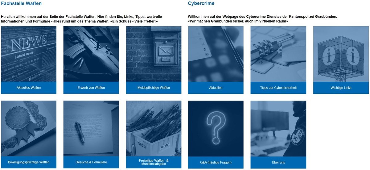 Neu sind wertvolle Tipps, Links und Informationen im Bereich des Waffenerwerbs sowie der Cyberkriminalität auf den neu erstellten Webseiten bei der Kantonspolizei Graubünden zu finden. Ganz nach dem Motto: «Ein Schuss – Viele Treffer» oder «Wir machen Graubünden sicher, auch im virtuellen Raum»
