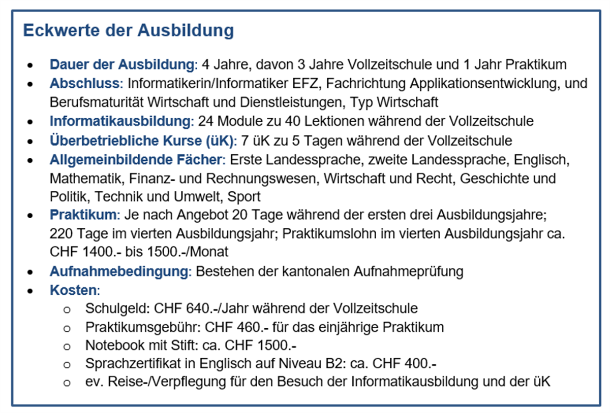 Die Ausbildung richtet sich an leistungsstarke Jugendliche mit einem grossen Interesse an Informatik, Wirtschaft und allgemeinbildendenden Fächern. Sie gliedert sich in eine dreijährige schulische Ausbildung sowie ein einjähriges Berufspraktikum.