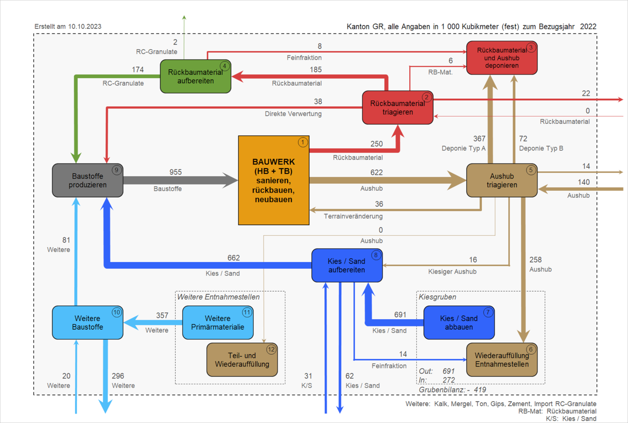 Der Kanton Graubünden hat für das Bezugsjahr 2020 erstmals ein kantonales KAR-Modell erstellen lassen. Das KAR-Modell GR wurde ab dem Bezugsjahr 2022 in die gemeinsame Modellierung mit den anderen Kantonen integriert, womit dann auch die kantonsübergreifenden Materialflüsse bestimmt und die Input-Outputanalyse mit allen beteiligten Kantonen etabliert werden konnte. Damit wird ein proaktives Vorgehen zur Steuerung der Materialflüsse sowie die Planung entsprechender Deponie- und Verwertungskapazitäten möglich. Zudem unterstützen die mit dem Modell generierten Grafiken und Tabellen die Behörden bei der Kommunikation mit den betroffenen Akteuren.