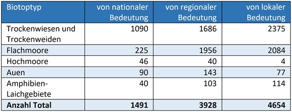 Trockenwiesen, Trockenweiden und Flachmoore machen sowohl zahlen- als auch flächenmässig den grössten Teil der Biotope im Kanton aus (vgl. Tab. 1 und 2). Sie benötigen eine extensive Bewirtschaftung, damit sie als Lebensräume erhalten bleiben. Dies bedeutet: