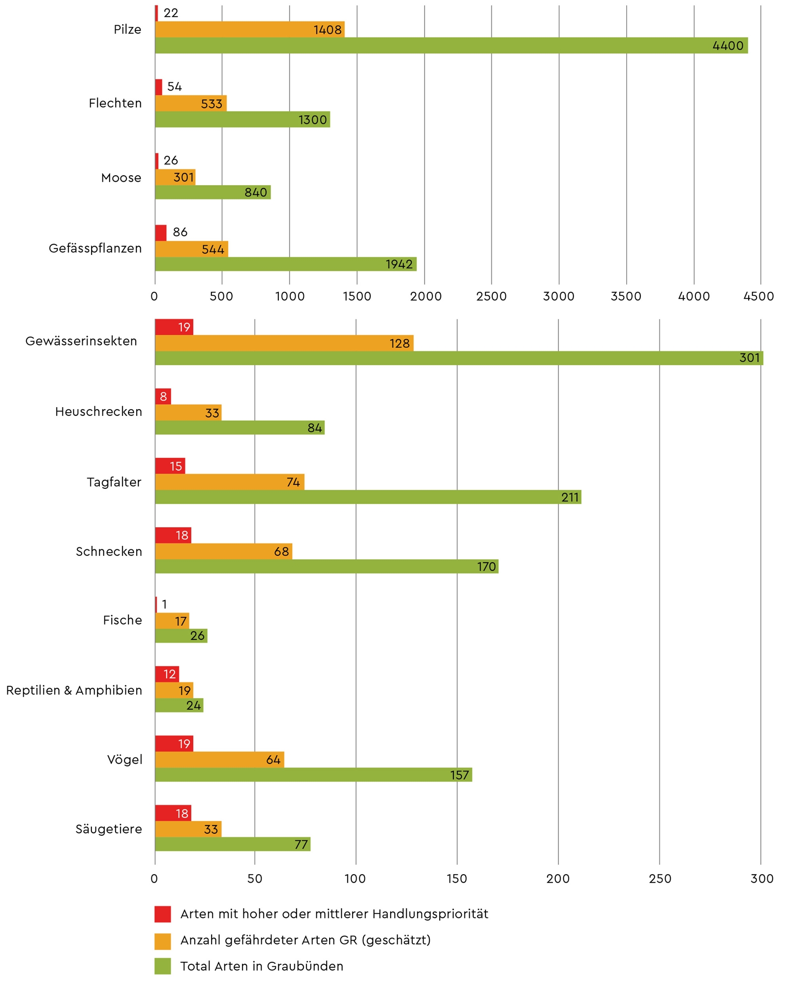 Diese Grafik zeigt die Anzahl der Arten, für die wir dringend Massnahmen ergreifen sollten, im Verhältnis zur gesamten Artenvielfalt in Graubünden. Folgende Organismengruppen, für die keine Roten Listen existieren und für die eine Abschätzung der Artenvielfalt schwierig ist, sind in dieser Grafik nicht abgebildet: