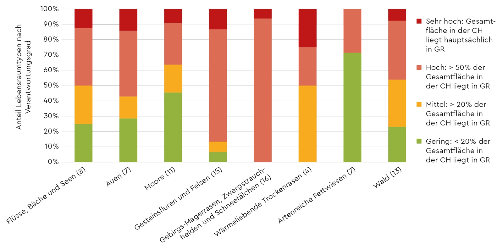 Diese Grafik zeigt den Anteil der Lebensraumtypen für verschiedene Lebensraumbereiche und Lebensraumgruppen nach Verantwortungsgrad in Graubünden (in Klammer: Anzahl Lebensraumtypen). Die kantonale Verantwortung ergibt sich durch den Flächenanteil des Lebensraums in der Schweiz, der im Kanton Graubünden liegt. Quelle: Grundlagebericht Biodiversität in Graubünden 2022, S.259.