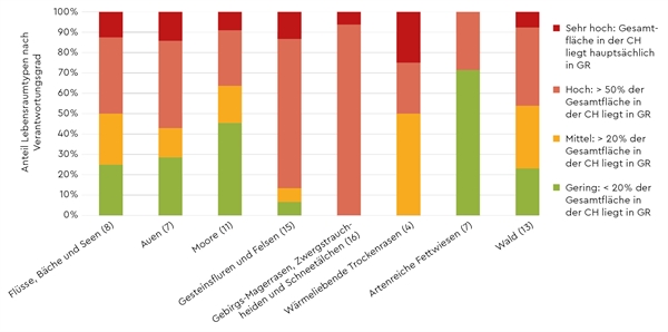 Gemäss dem Grundlagebericht Biodiversität in Graubünden 2022 beherbergt Graubünden eine grosse Vielfalt an Lebensräumen. So kommen in unserem Kanton fast 90 % der 225 Lebensraumtypen der Schweiz vor. Für 63 % der Bündner Lebensraumtypen hat unser Kanton gemäss Bundesamt für Umwelt (BAFU) eine hohe bis sehr hohe Verantwortung (siehe untenstehende Abbildung).