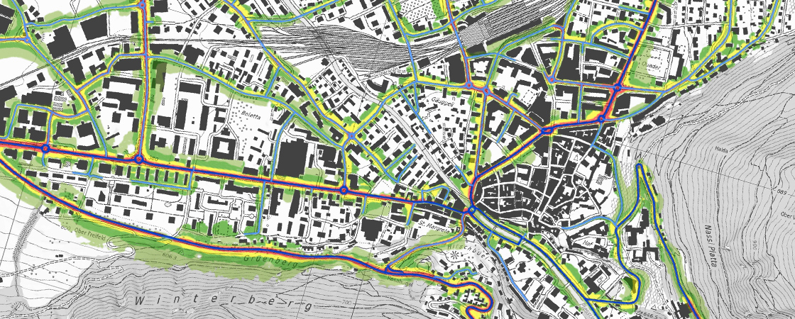 Zur Abklärung, ob sich geplante oder bestehende Bauzonen sowie Bauvorhaben in einem lärmbelasteten Gebiet mit möglichen Überschreitungen des Planungswertes befinden, steht den Gemeinden der Lärmbelastungskataster Strassen des Amt für Natur und Umwelt zur Verfügung.