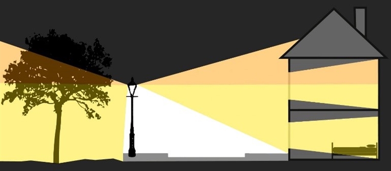 Oft wird unser Lebensraum unnötigerweise von künstlichem Licht durchdrungen. In diesem Falle spricht man umgangssprachlich von «Lichtverschmutzung». Zur Illustration dieses Beispiel: Das Licht der Strassenlampe soll eigentlich nur die Strasse und die beiden Trottoirs erhellen (weiss). Jedoch erhellen wesentliche Teile des ausgestrahlten Lichts (gelb und orange) unnötigerweise andere Bereiche der Umgebung. Diese Lichtverschmutzung lässt sich durch die Wahl einer Lampe, die ihr Licht gezielt nur in Richtung Strasse und Trottoirs ausstrahlt, vermeiden. Quelle: Vollzugshilfe Empfehlungen zur Vermeidung von Lichtemissionen.