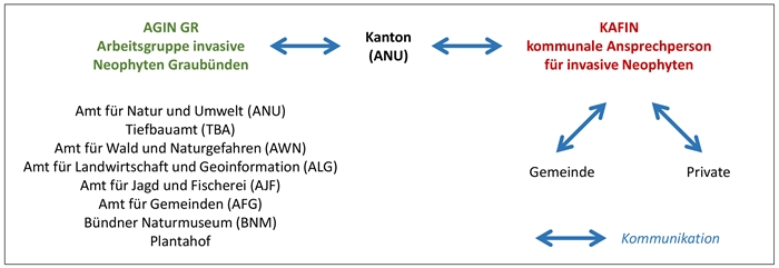 In Graubünden ist das Amt für Natur und Umwelt (ANU) für die Bekämpfung der Neobiota zuständig. Es arbeitet im Rahmen der Arbeitsgruppe invasive Neobiota Graubünden (AGIN GR) mit verschiedenen kantonalen Dienststellen zusammen (Amt für Landwirtschaft und Geoinformation, Amt für Wald und Naturgefahren, Amt für Gemeinden, Amt für Jagd und Fischerei usw.).
