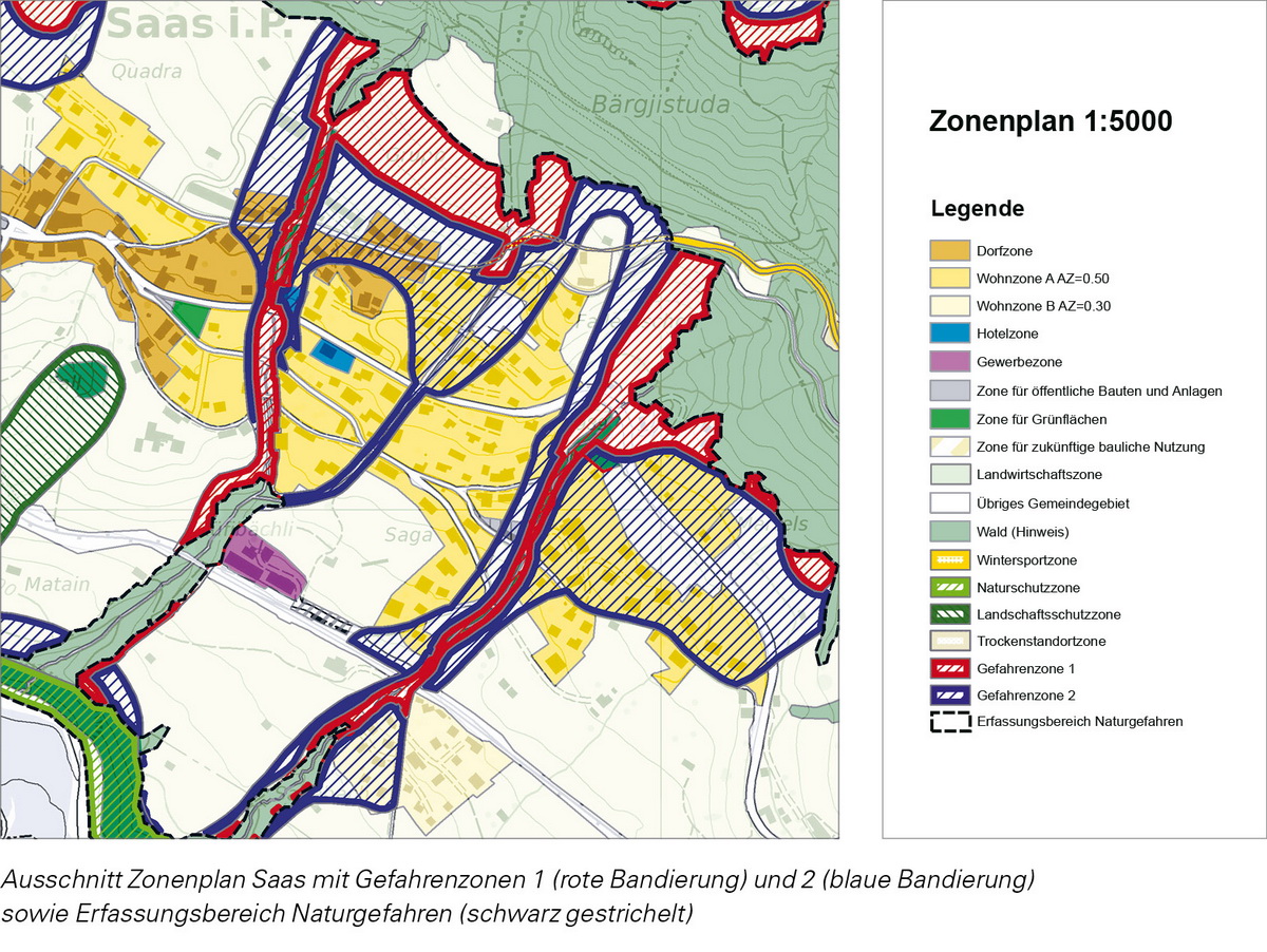 Mit der flächendeckenden Ausscheidung von Gefahrenzonen durch den Forstdienst ab ca. 1975 (zuerst vorwiegend für Lawinen) konnte bereits sehr früh eine der Gefährdung angepasste Raumnutzung angestrebt werden. Zwischenzeitlich wurden die Gefahrenzonen von den Gefahrenkommissionen laufend aktualisiert und zunehmend werden auch weitere Prozesse aus den Gefahrenkarten Wasser, Steinschlag und Rutschung berücksichtigt. Die Gefahrenzonen werden nur innerhalb der Erfassungsbereiche dargestellt; sie haben sich sehr bewährt.