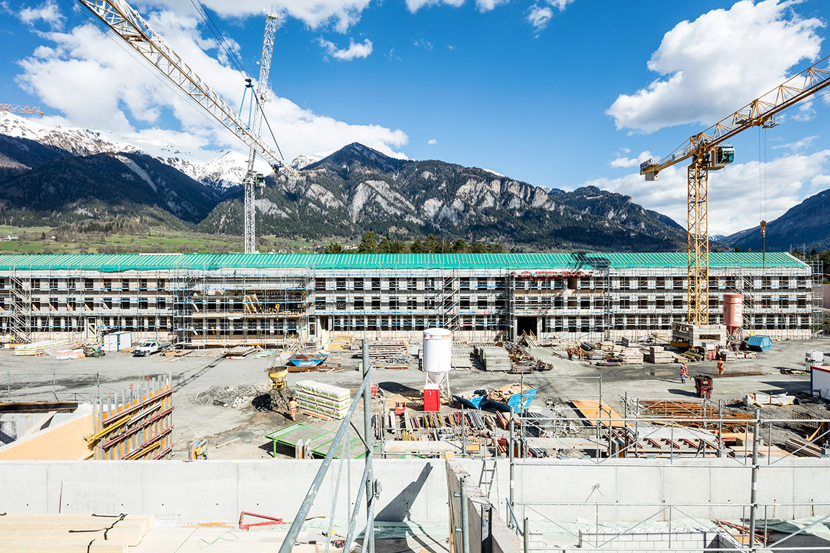 Per la realizzazione della costruzione grezza sono stati impiegati 14 000 metri cubi di calcestruzzo per costruzioni e 1300 tonnellate di acciaio di armatura. I molti impianti da integrare nella costruzione grezza per i numerosi e variegati impianti tecnici e di sicurezza che hanno dovuto essere montati nei termini previsti nonostante gli elevati ritmi di lavoro, hanno reso più complicato il lavoro degli installatori. I tetti a falda sono costituiti da elementi prefabbricati in legno per un volume di 580 metri cubi di legno per costruzioni. Il volume del tetto viene sfruttato come spazio per gli impianti tecnici dato che per via dell'elevato livello delle acque sotterranee si è in ampia parte rinunciato a procedere alla realizzazione di costosi piani interrati. Con il montaggio degli ultimi elementi del tetto della sala multiuso si sono conclusi i lavori da carpentiere e la festa di copertura dell'edificio può essere celebrata oggi con soddisfazione per il lavoro svolto.
