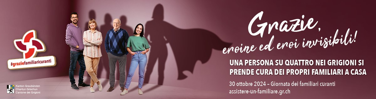 In occasione della Giornata intercantonale di mobilitazione in favore dei familiari curanti del 30 ottobre, l'Ufficio dell'igiene pubblica dei Grigioni, insieme a diverse organizzazioni professionali, desidera dire GRAZIE a coloro che ogni giorno mettono il cuore e l'anima nell'assistenza ai propri familiari malati o infortunati. Anche quest'anno vorremmo esprimere la nostra gratitudine.