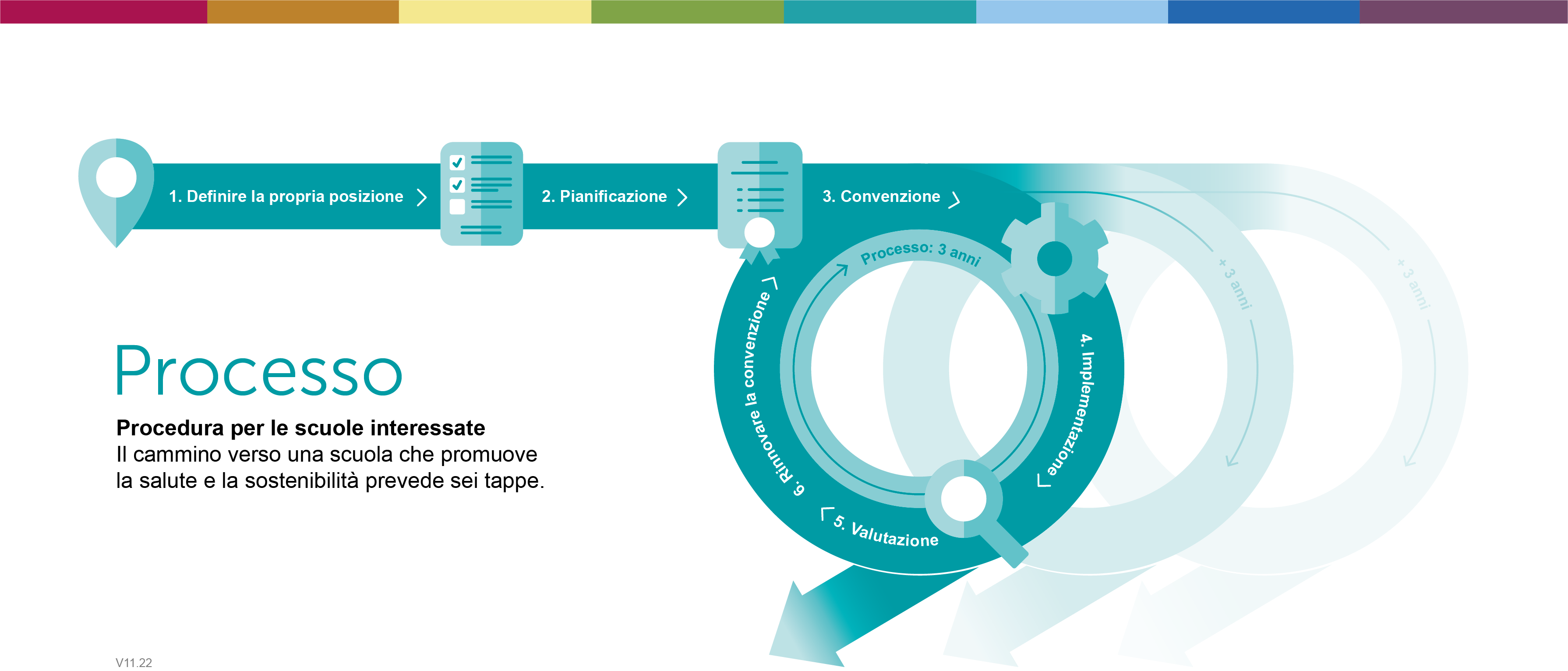 Il cammino verso una scuola che promuove la salute e la sostenibilità varia da scuola a scuola e non è sempre lineare. Tuttavia, ci sono sei tappe del processo che si sono dimostrate valide nella pratica e che dovrebbero fornire un orientamento per il proprio processo di sviluppo.