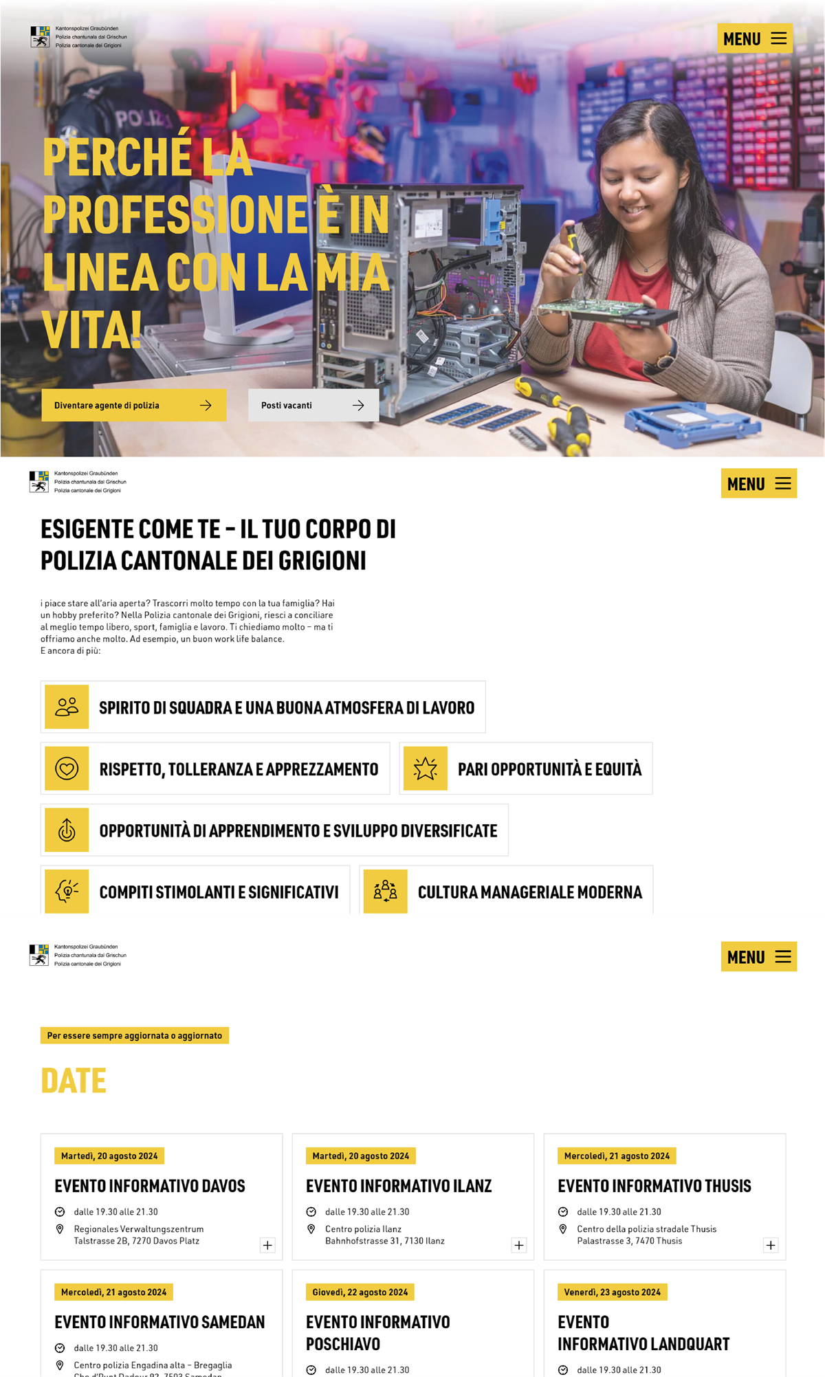Da giugno 2024 il nuovo sito web jobs.kapo.gr.ch è online. Esso presenta i settori professionali della Polizia cantonale dei Grigioni e informa in merito al percorso che porta alla professione di agente di polizia. Le campagne promozionali vengono pubblicate sui social media e nei motori di ricerca all'insegna dello slogan "Perché la professione è in linea con la mia vita".