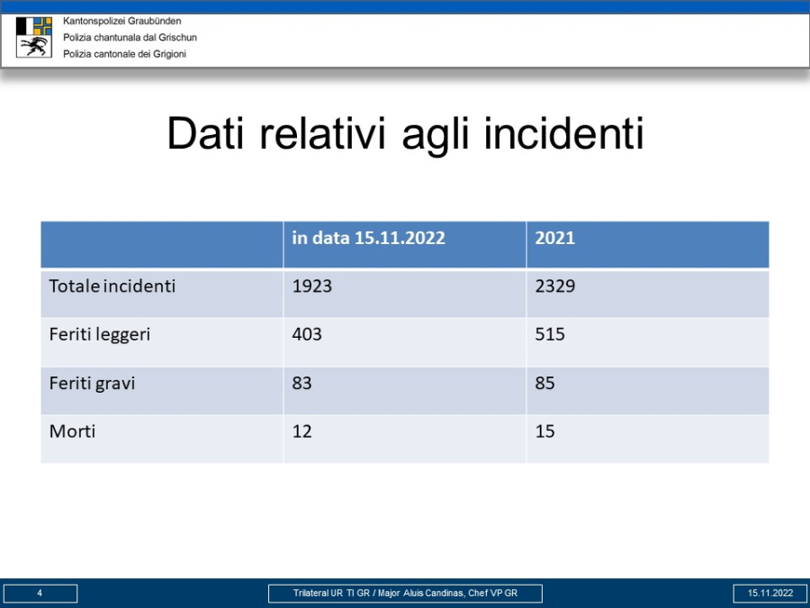 Il 15 novembre si è tenuto un incontro tra i comandanti dei corpi di polizia cantonale dei Cantoni di Uri, Ticino e dei Grigioni. I comandanti sono stati accompagnati dal rispettivo capo della Polizia stradale. L'incontro è servito allo scambio di esperienze e di informazioni attuali in materia di polizia stradale e ha luogo ogni anno in autunno. Il colonnello Walter Schlegel è stato accompagnato dal maggiore Aluis Candinas all'incontro che si è svolto presso il Centro di controllo del traffico pesante a Giornico/TI. Quest'ultimo ha presentato ai partecipanti i dati relativi agli incidenti stradali registrati in data di riferimento 15 novembre 2022 e ha tenuto una relazione sui fulcri della prevenzione degli incidenti in moto della Polizia cantonale dei Grigioni.
