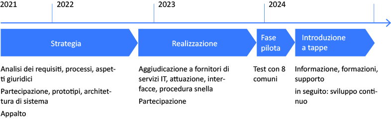 - Entro metà 2022: fase di sviluppo: chiarimento ed elaborazione concettuale di processi necessari, competenze, fasi della procedura, interfacce, aspetti giuridici ecc.; procedura di partecipazione per tenere conto dei requisiti e delle esigenze di tutti gli attori rilevanti; determinazione dei requisiti tecnici posti alla piattaforma elettronica.