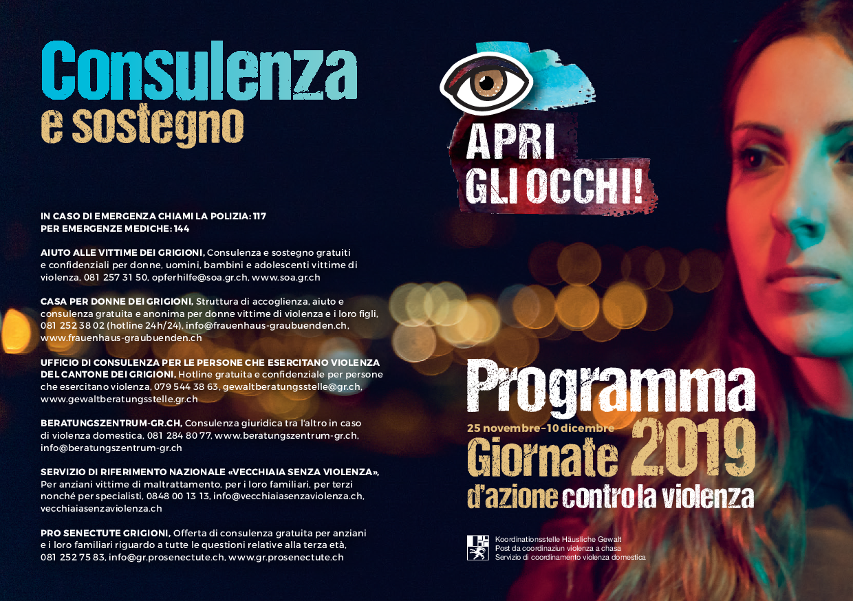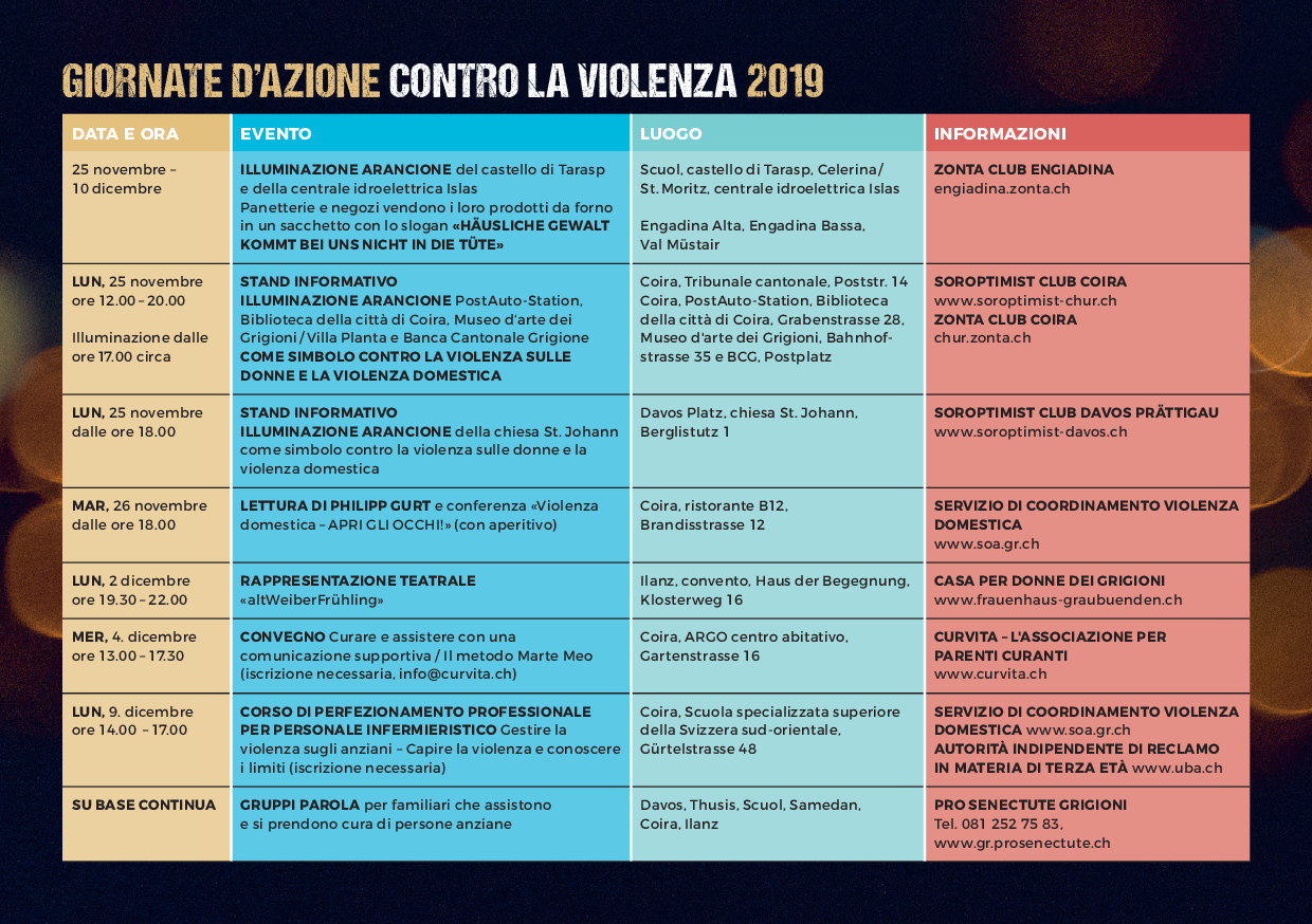 La violenza domestica e quella sulle donne spesso rimangono nell'ombra. Con le giornate d'azione contro la violenza dal 25 novembre al 10 dicembre 2019 diverse organizzazioni nei Grigioni richiameranno l'attenzione su queste forme di violenza. La giornata internazionale contro la violenza sulle donne segna l'inizio delle giornate d'azione. Il 25 novembre 2019 diversi edifici in tutto il Cantone verranno illuminati di arancione per dare visibilità simbolica a questa forma di violenza.