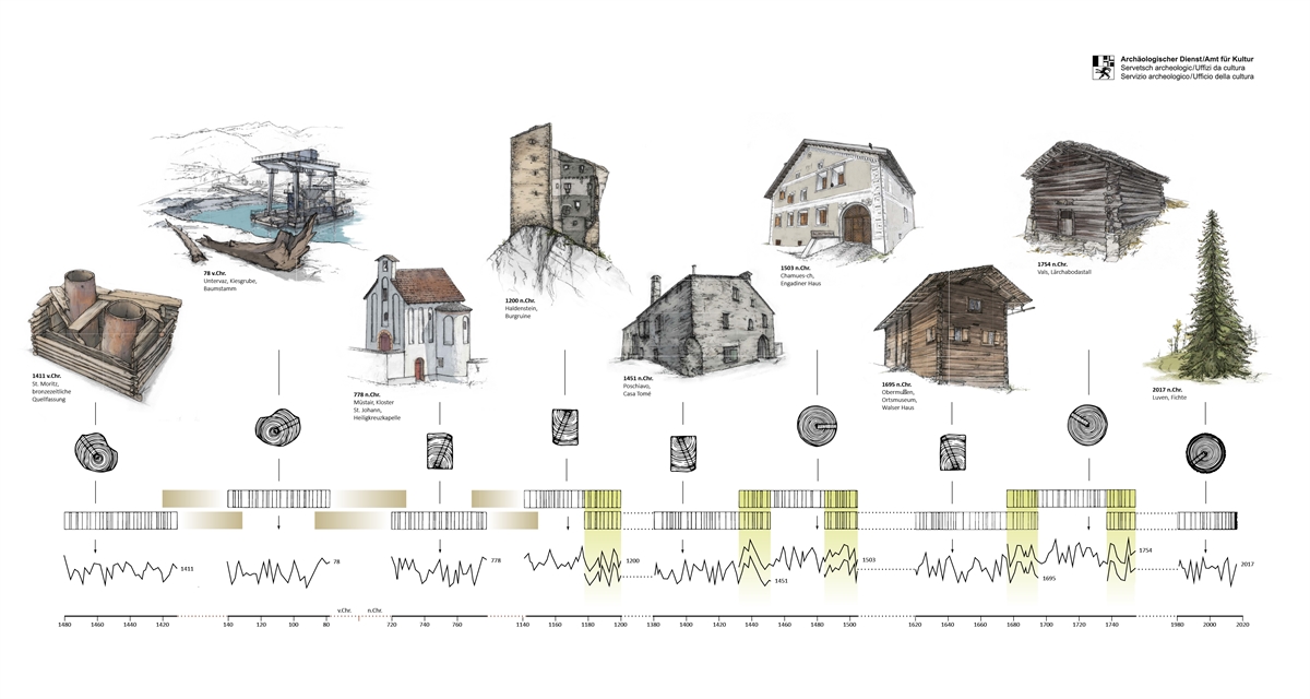 Il laboratorio dendrocronologico del Servizio archeologico, istituito nel 1997, si occupa principalmente di progetti interni. Nell'ambito di restauri di edifici e chiarimenti relativi alla messa sotto protezione di edifici, il laboratorio accetta anche incarichi di determinazione dell'età da parte del Servizio monumenti dei Grigioni.