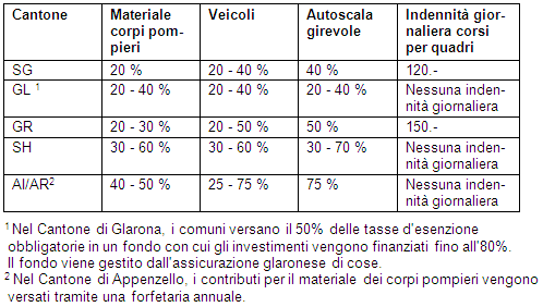 L'art. 40 della legge sulla protezione antincendio preventiva e sui pompieri del Cantone dei Grigioni disciplina i contributi ai corpi pompieri. L'Assicurazione fabbricati (AFG) partecipa agli investimenti appropriati e conformi al fabbisogno dei corpi pompieri grigionesi per depositi apparecchi, materiale, allarme e veicoli, nonché alle spese di formazione e perfezionamento dei quadri del corpo pompieri.