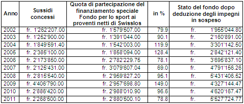 Da un sondaggio tra i responsabili del Fondo per lo sport, svolto in occasione del convegno dei Cantoni Swisslos dell'11 maggio 2012 a Basilea, risulta che la maggior parte dei Cantoni tiene una riserva di circa due aliquote annuali per poter compensare le oscillazioni annuali e per essere in grado di intervenire in caso di progetti infrastrutturali e di sviluppo di maggiori dimensioni. Esempi tratti da altri Cantoni, il cui fondo per lo sport 2010 presentava un disavanzo di decine di milioni di franchi, mostrano che una concessione di sussidi troppo generosa non è a lungo termine nell'interesse delle associazioni e delle federazioni.