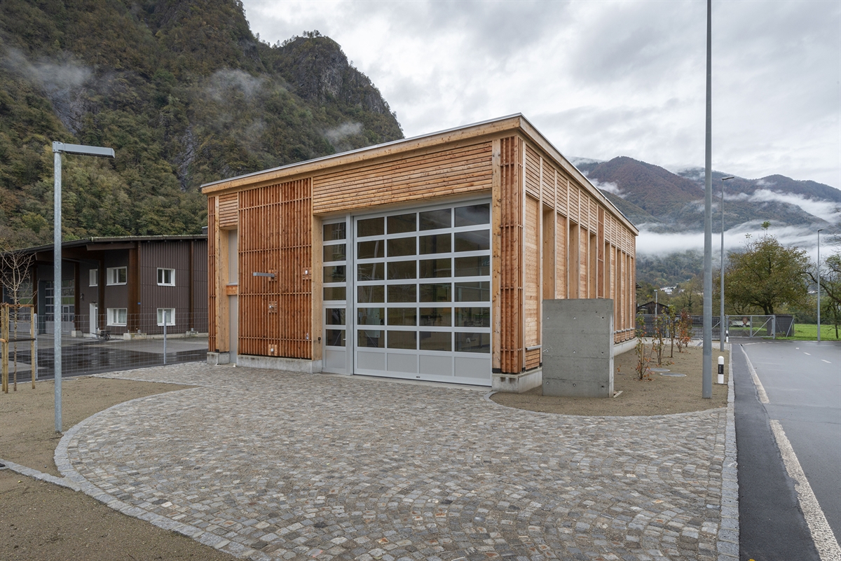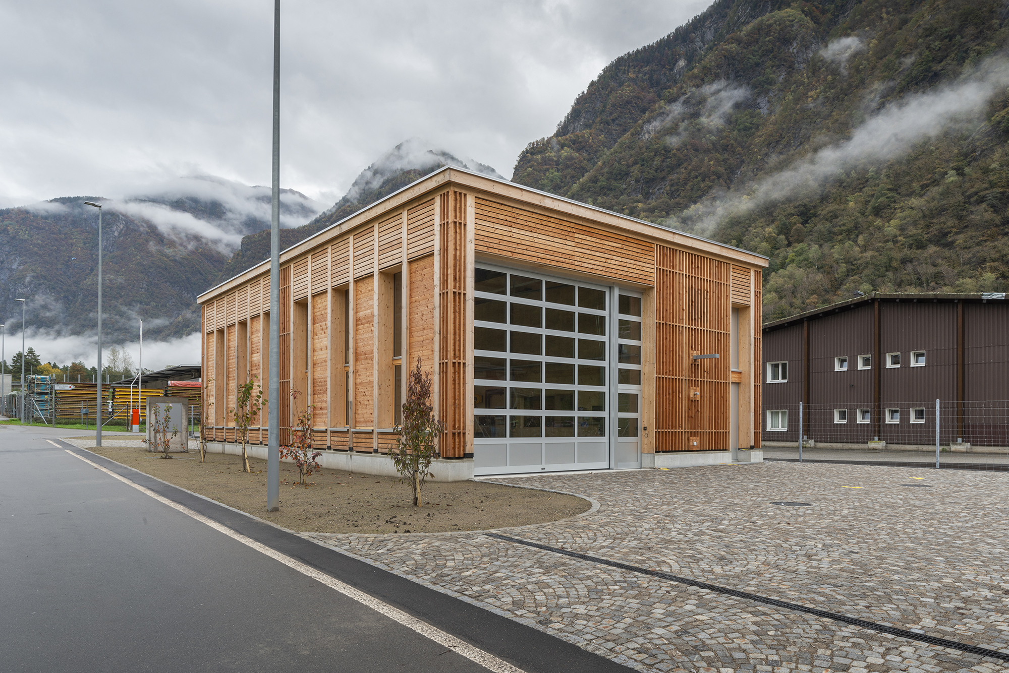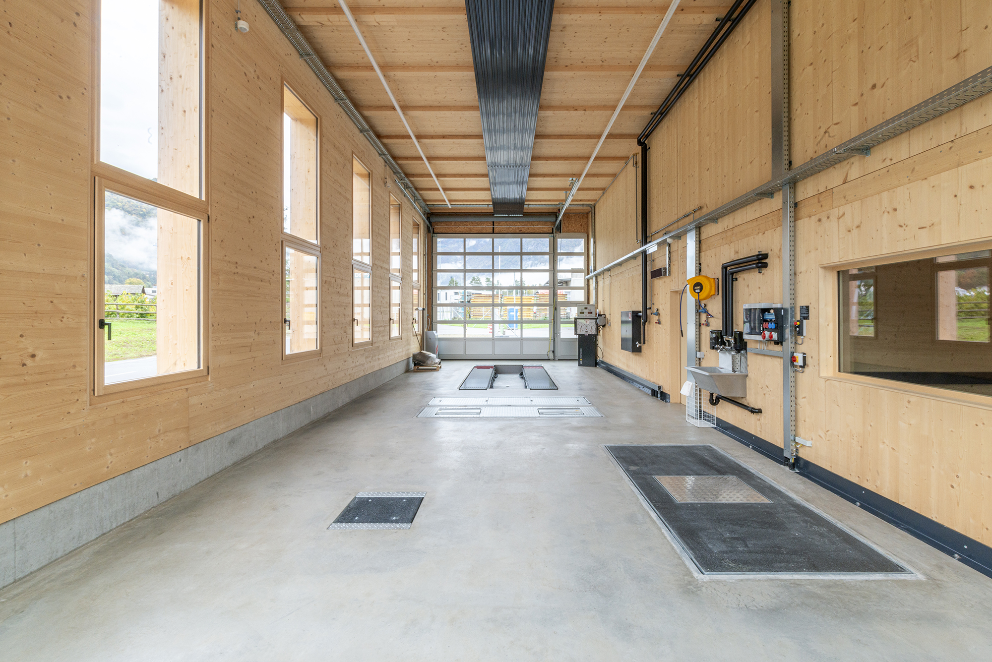 Si tratta di un edificio efficiente dal punto di vista energetico e rispettoso delle risorse. Si è ad esempio volutamente rinunciato a trattamenti delle superfici e a intonaci nonché a rivestimenti di pavimenti e pareti. Inoltre sono stati installati meno impianti tecnici possibili e l'energia elettrica viene prodotta tramite moduli fotovoltaici sulla facciata e sul tetto. L'edificio è completamente rivestito in legno svizzero; il legno di larice della facciata proviene dalla Mesolcina. Inoltre tutta l'area esterna è stata realizzata con ciottolato proveniente dalla strada del paese di Mesocco. «La costruzione della nuova sede per il collaudo ha un carattere esemplare in termini di rinuncia al superfluo, collaborazione con imprese locali ed economia circolare», sottolinea il capo servizio cantonale delle costruzioni Andreas Kohne.
