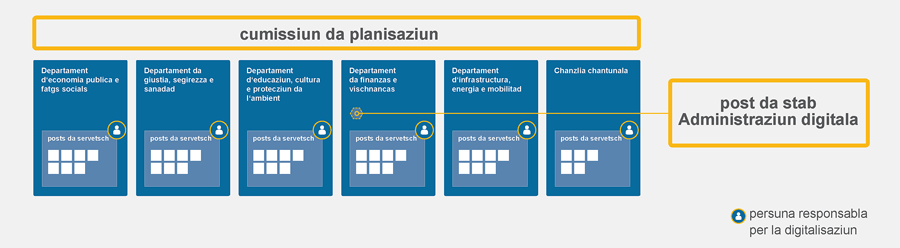 - En mintga departament datti da nov ina responsabla u in responsabel per la digitalisaziun. Questa persuna è mintgamai responsabla per la cussegliaziun, la coordinaziun ed il svilup da mesiras per la transfurmaziun digitala da quest departament e ses posts da servetsch.