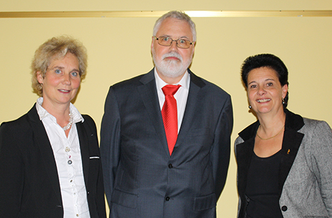 Hansjürg Bollhalder, schef da la controlla da finanzas, po prender encunter ils giavischs da la presidenta dal cussegl grond Elita Florin-Caluori e da la presidenta da la CdG Tina Gartmann-Albin (a dretga) per il giubileum dal post chantunal da revisiun.