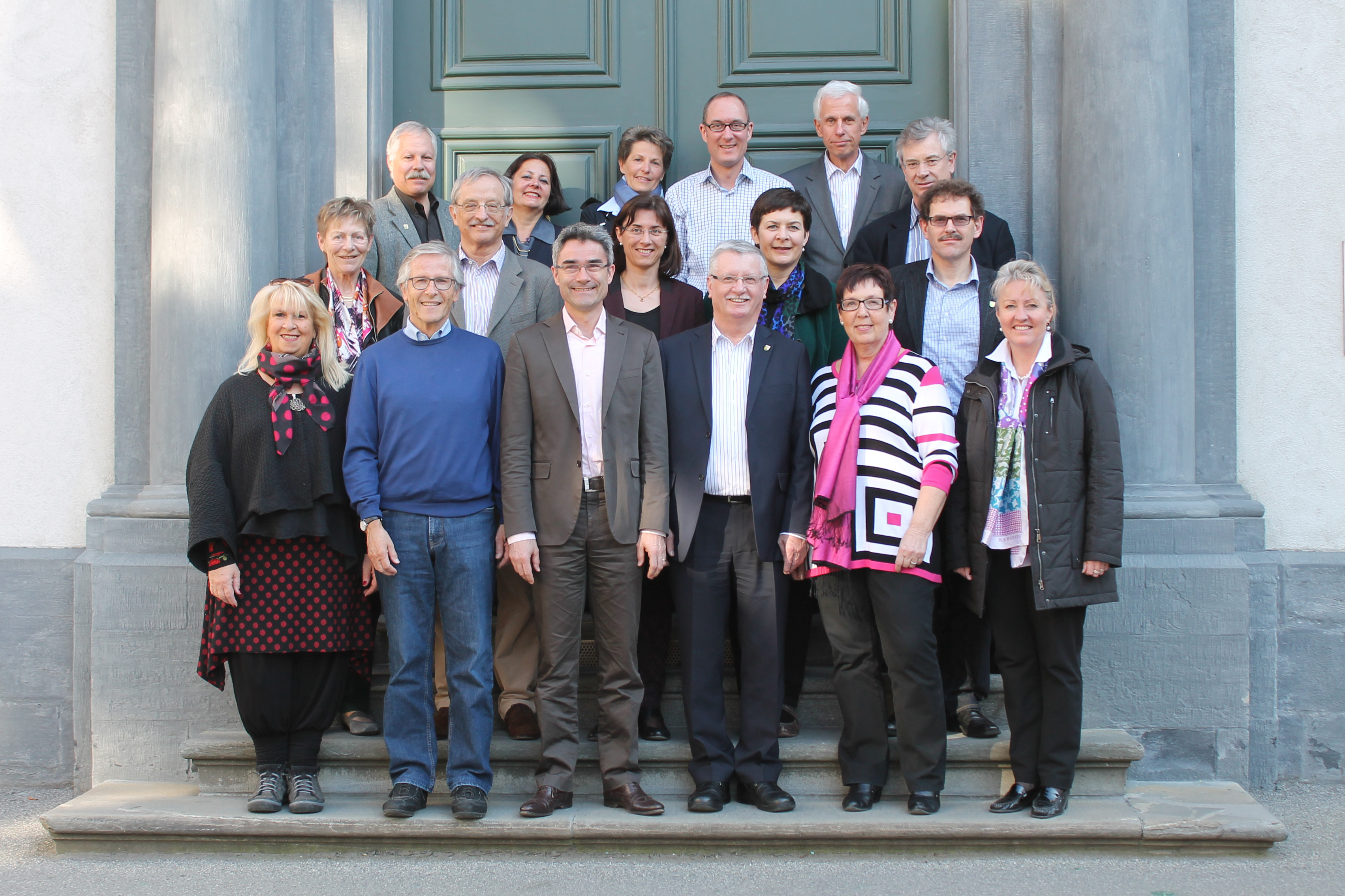Las duas delegaziuns cun il president da la regenza Bernhard Koch (Turgovia) e Mario Cavigelli (Grischun), (entamez), davant la chasa grischa a Cuira.
