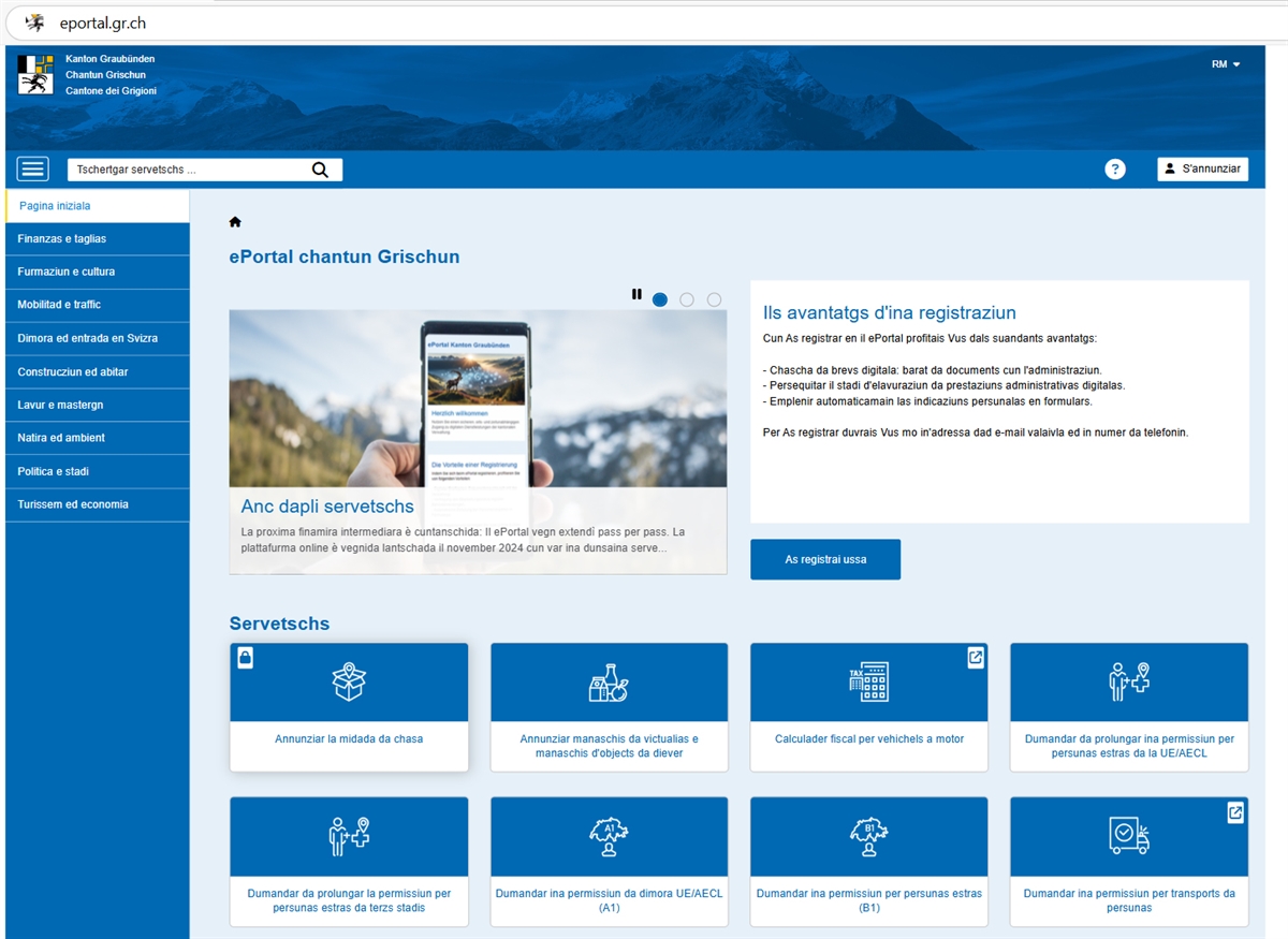 Il ePortal (eportal.gr.ch) è ina plattafurma digitala centrala per la populaziun e per l'economia. Ella pussibilitescha in access simpel e segir a servetschs administrativs digitals.