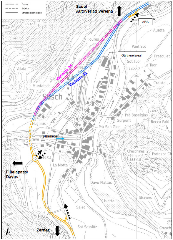 - Illustraziun 1: Survista da tut las duas variantas per distgargiar Susch dal traffic (30 e 31)