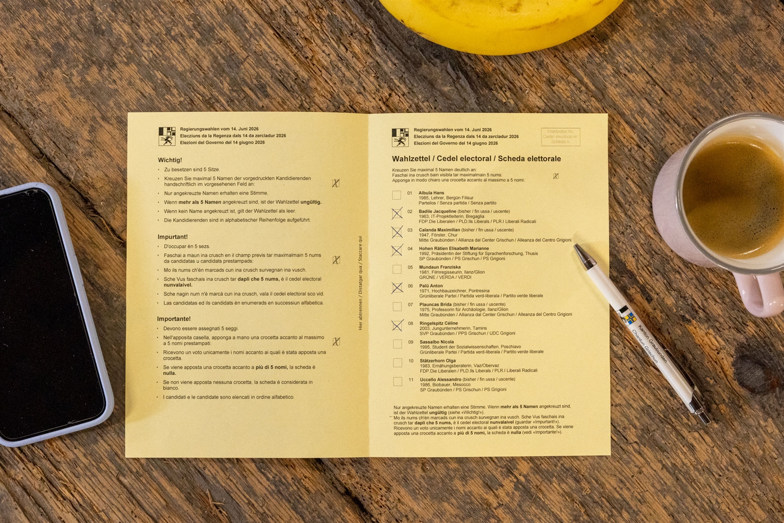 - En ils champs previs sin il cedel electoral dastgan ins far persunalmain ed a maun ina crusch (x) tar maximalmain 5 nums da candidatas e candidats prestampads (las candidatas ed ils candidats èn enumerads en successiun alfabetica).